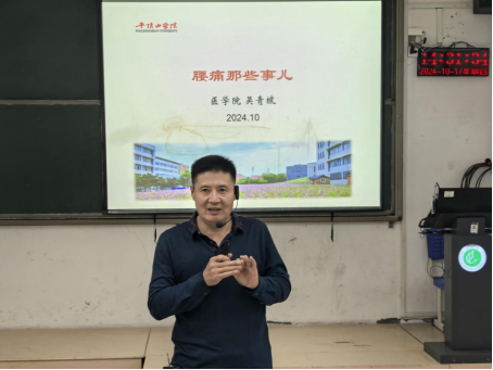 吴青坡主任从事骨科临床工作14年,从事医学教学工作15余年,具有丰富的临床实践经历和课堂教学经验。讲座中,他从腰椎解剖图切入,带领同学们初步了解腰椎的结构,并用风趣的语言从骨骼因素和非骨骼因素讲述了腰痛的发病原因及致病机理。随后,吴主任通过讲解腰痛常见疾病,进一步引起同学们对腰痛问题的重视,并介绍了相应的治疗方法。讲座最后,他还展示了不同姿势腰椎压力的横向对比图,由浅入深的引出了腰痛的预防方法,嘱咐同学们规范日常行为动作,帮助同学们远离腰痛,减少困扰。