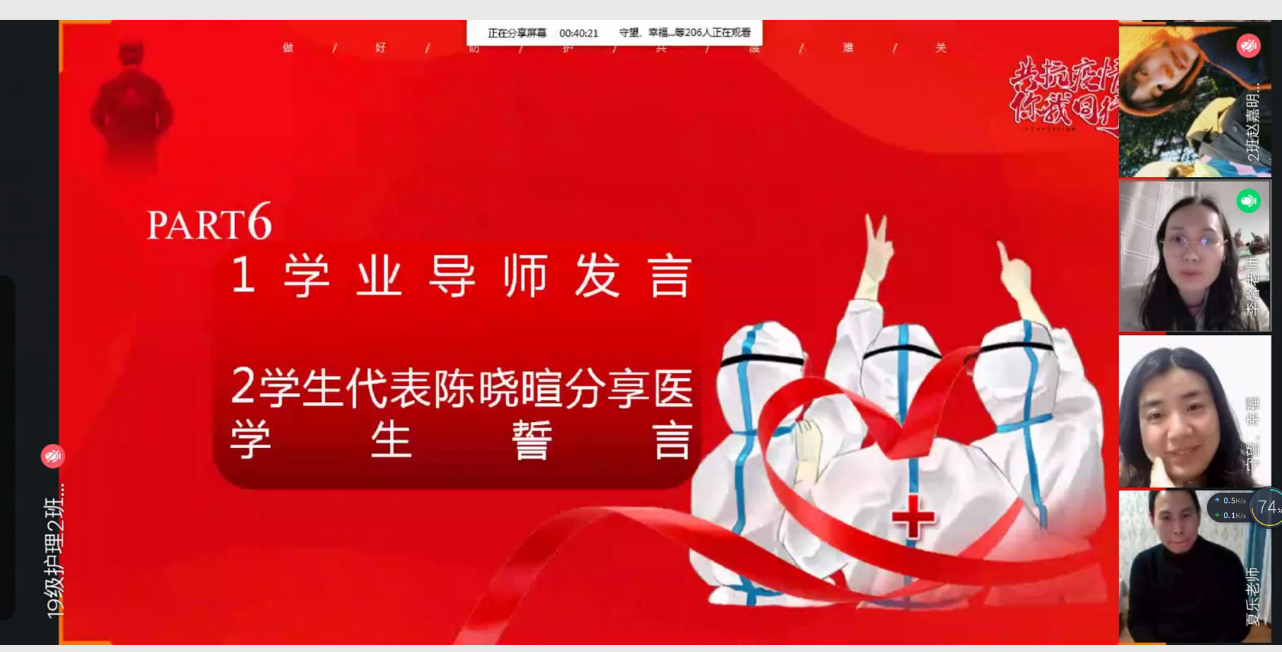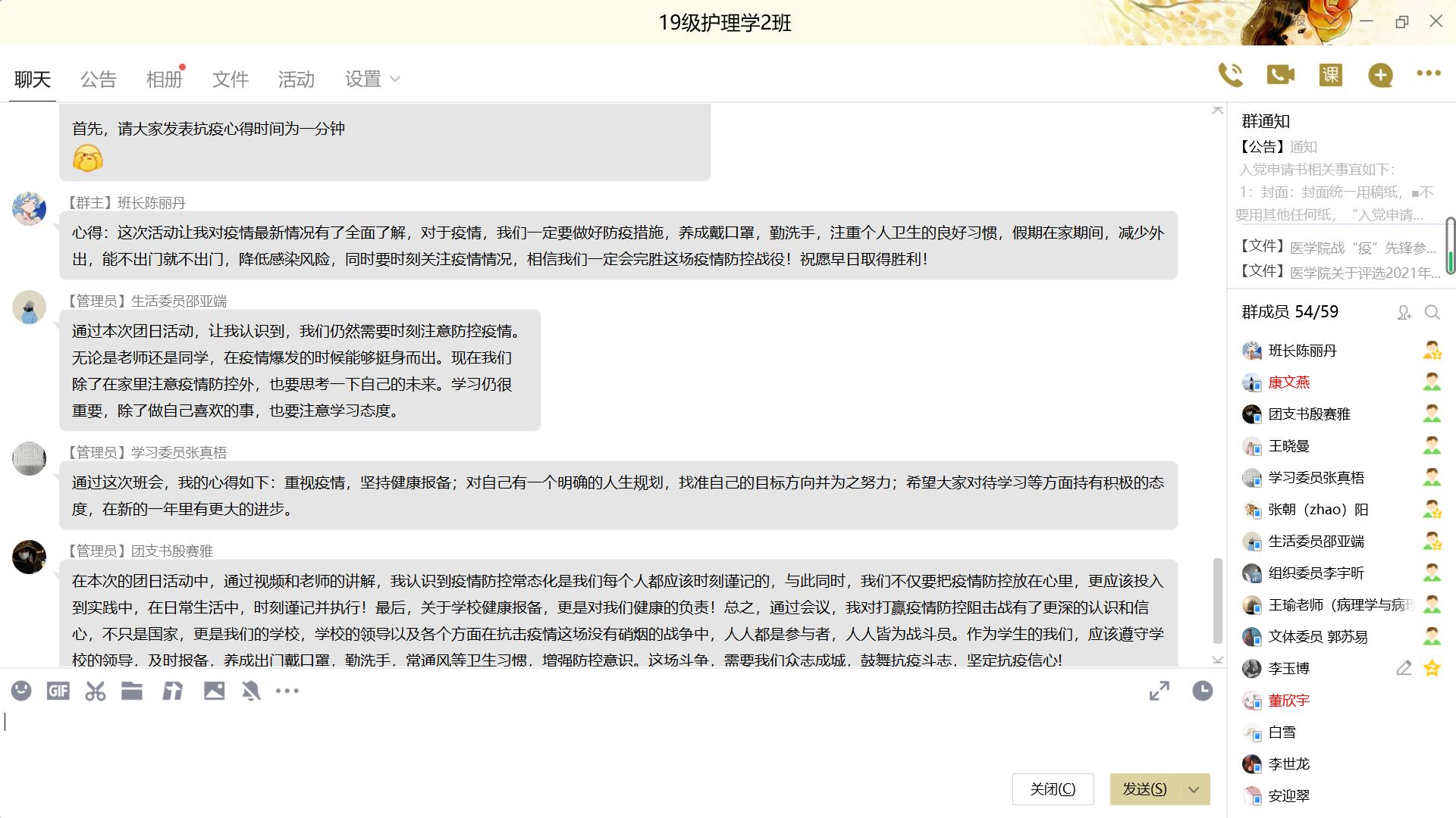 活动以网络平台直播、会议等形式集中开展,内容丰富多样,团日活动囊括组织员工观看信誉最好的十大体育平台“战疫情,我们能”短视频,学习书记、董事长致全体学子及家长的一封信,带领同学们宣讲医员工誓言,为抗击疫情的一线人员加油祝福,学业导师、辅导员指导同学们寒假生活、学习等内容。活动期间,全体班级共同参与,上好疫情假期安全教育、思政教育、生命教育一堂课,同学们结合疫情在家如何参与防疫、实习实践医员工应该有何担当等话题,充分讨论,冲锋在前,以实际行动共同抗疫。最后,各专业辅导员向同学们传达评选战疫先锋通知,并从疫情防控、假期学习、学业发展、身心健康、实习就业等多个方面对同学们进行了叮咛和嘱咐,送上了节日的祝愿。