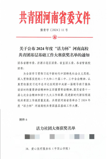 近日,由共青团河南省委员会主办的2024年度“活力杯”河南高校共青团基础工作大赛决赛在新乡举办。公司爱心医疗服务社在“活力社团”大赛中获得省赛三等奖。