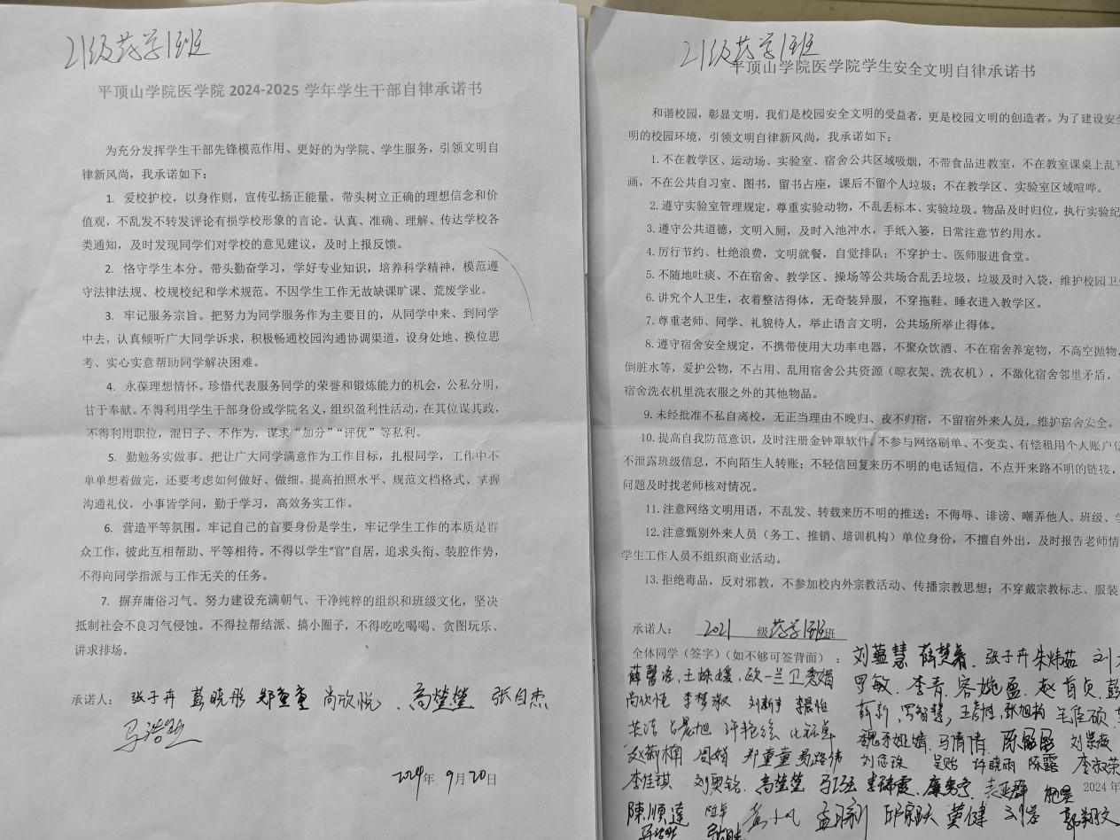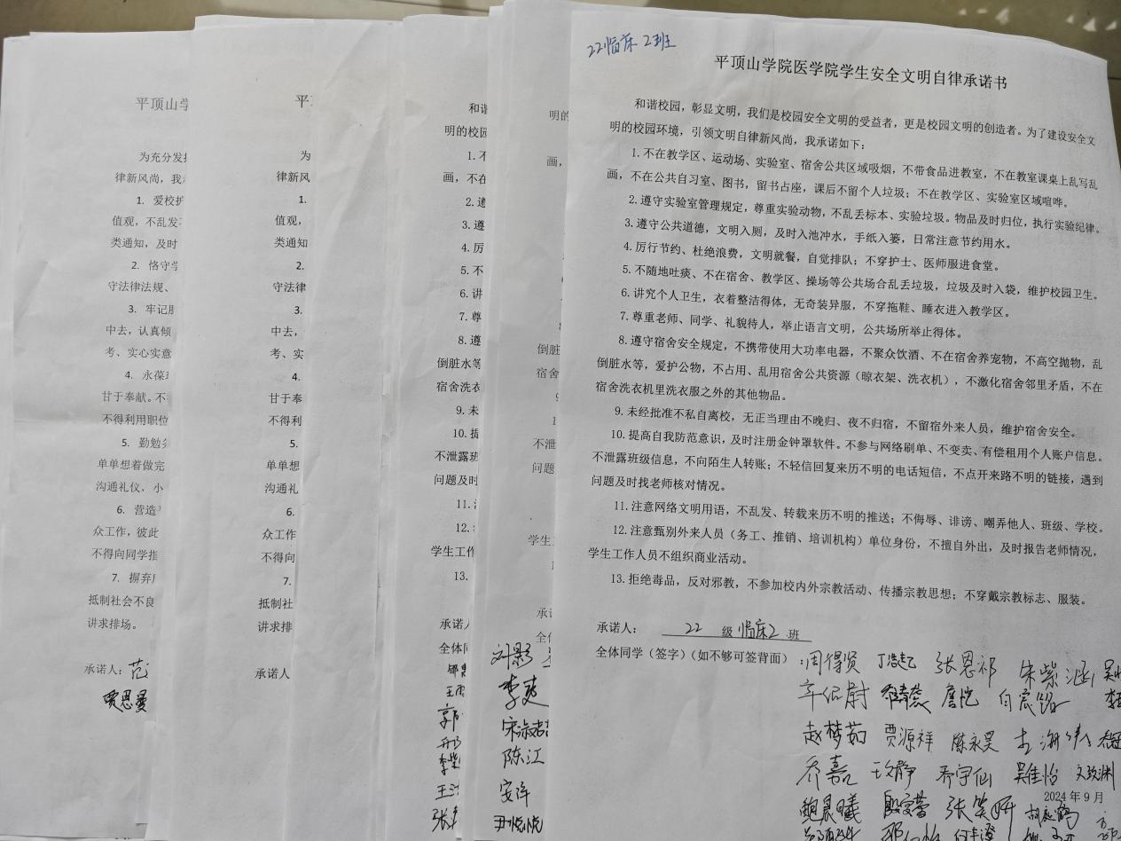 进入大学,树立起为自己行为负责的意识是老员工的第一节必修课。为创造文明平安校园,加强员工安全意识,提高校园、宿舍文明自律规范,信誉最好的十大体育平台全体在校生在2024年9月20日签订了文明自律承诺书,全体员工干部签订了信誉最好的十大体育平台2024-2025学年员工干部自律承诺书。