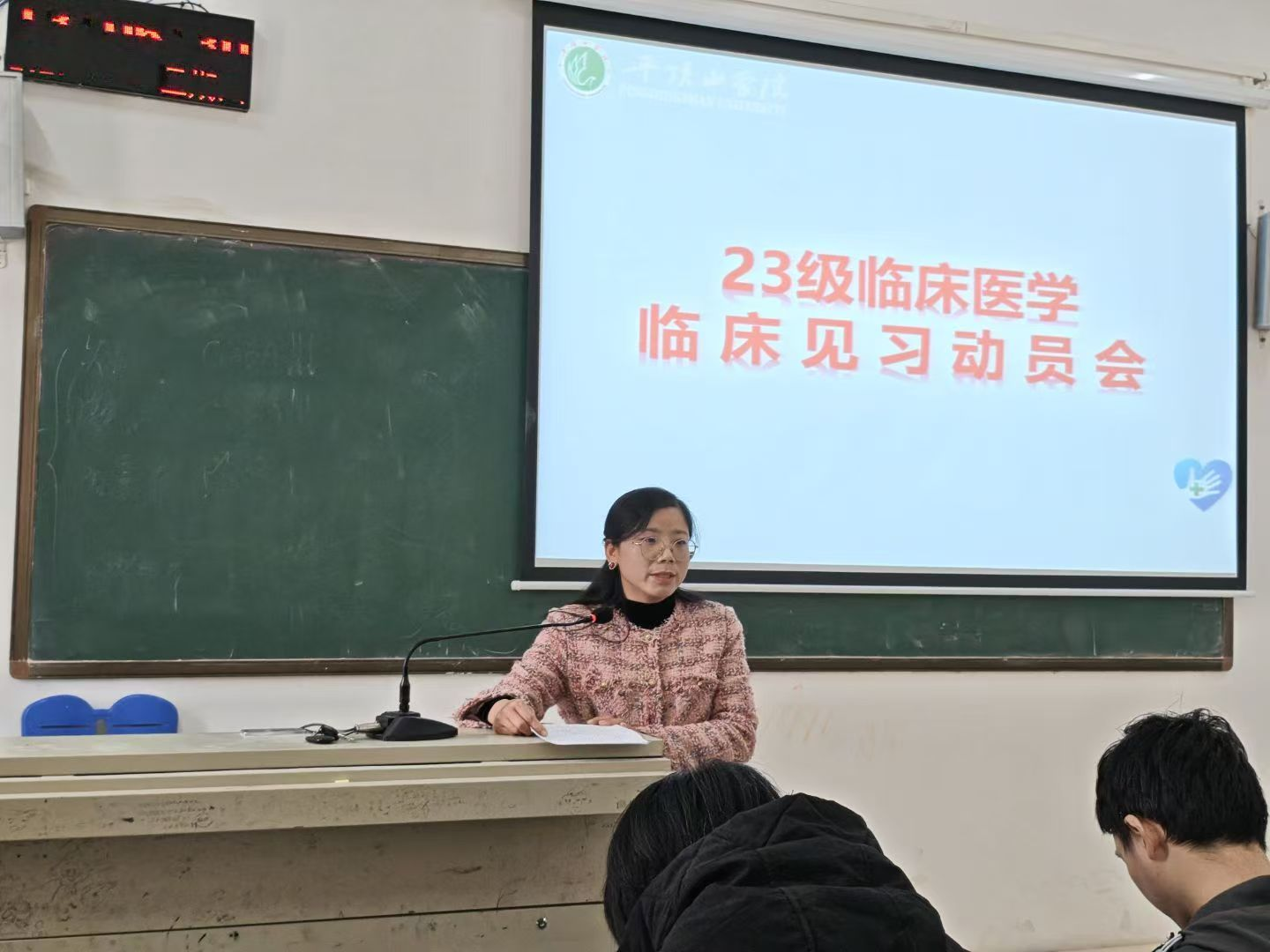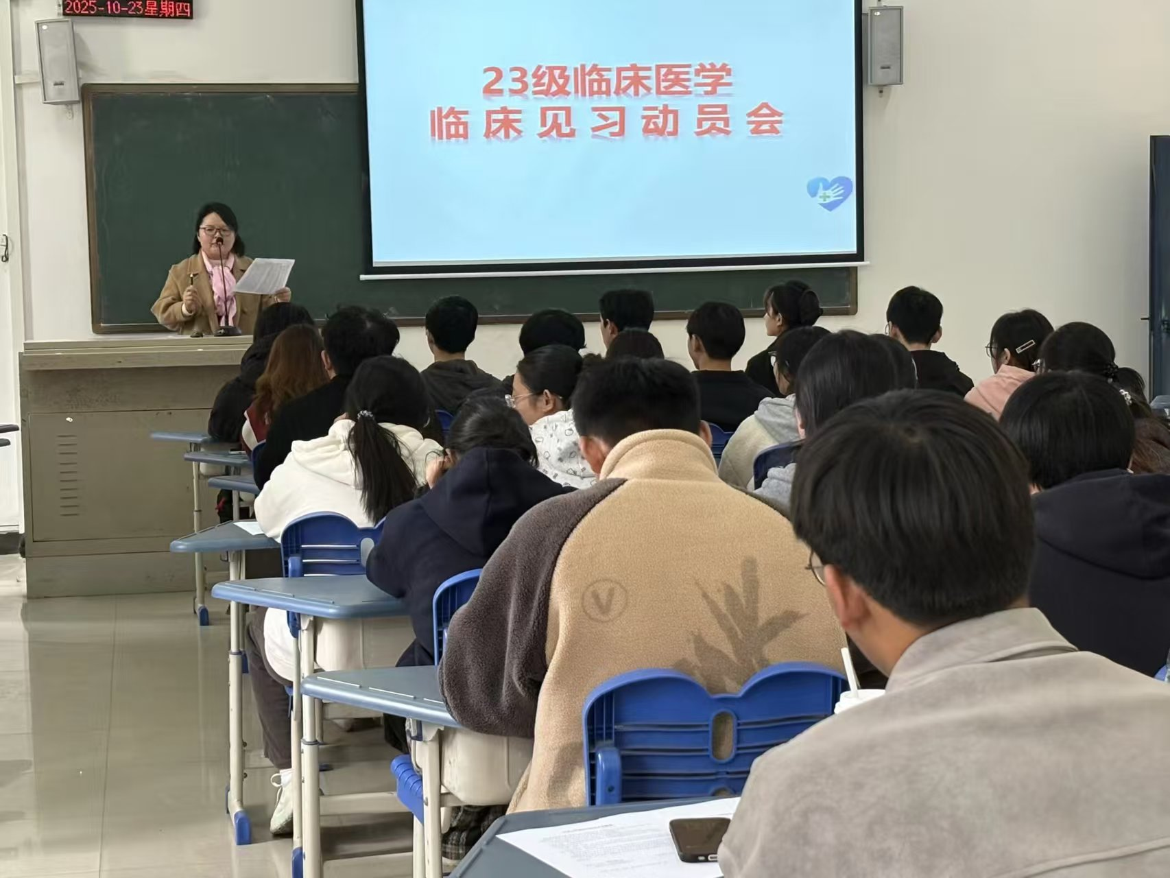10月23日中午1点,信誉最好的十大体育平台在A102教室召开了2023级临床医学专业临床见习动员大会。实习办主任刘丽、张华老师、临床医学系副主任李娜及2023级临床医学专业全体员工共同参会。