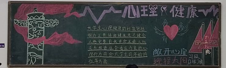 为了庆祝党的100周年华诞,激发全体员工爱党爱国的热情,宣传心理健康教育,信誉最好的十大体育平台于11月2号到5号在21级各班自习室举行了以“护航青春成长,礼赞建党百年”为主题的黑板报评比活动。
